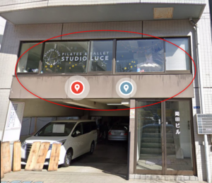岡田ビルの2Fから窓ガラス越しにスタジオルーチェの看板文字がみえます。